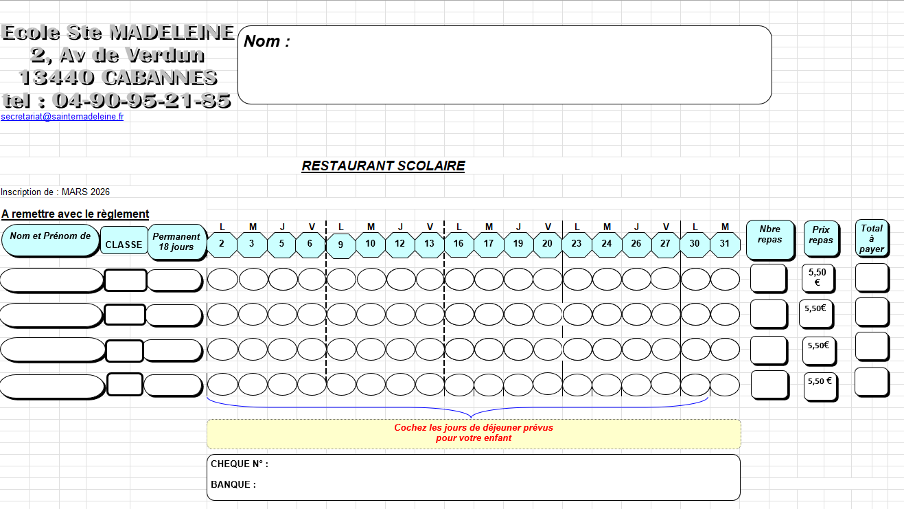 Feuille de cantine mensuelle